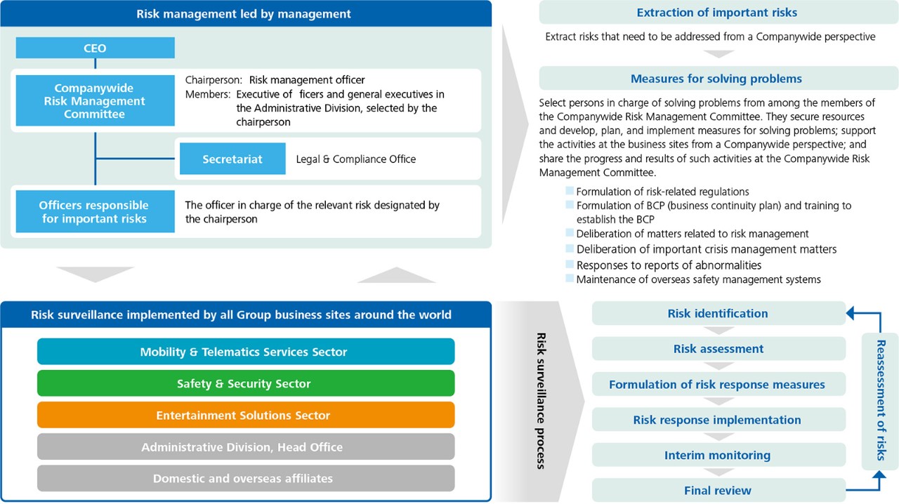 1. We have established the Company-wide Risk Management Committee hosted by the Chief Executive Officer (CEO), chaired by the director in charge of risk management, and composed of directors and heads of administrative divisions designated by the chairman. Based on business risks faced by business sites and identified by each business unit and region, as well as management issues and business issues, we will formulate measures to resolve “global important risks that should be addressed with the highest priority” extracted in light of their impact on business, urgency, and degree of incident, and designate an officer in charge of managing the relevant risks as the officer responsible for promoting countermeasures as a company-wide measure at the management level.