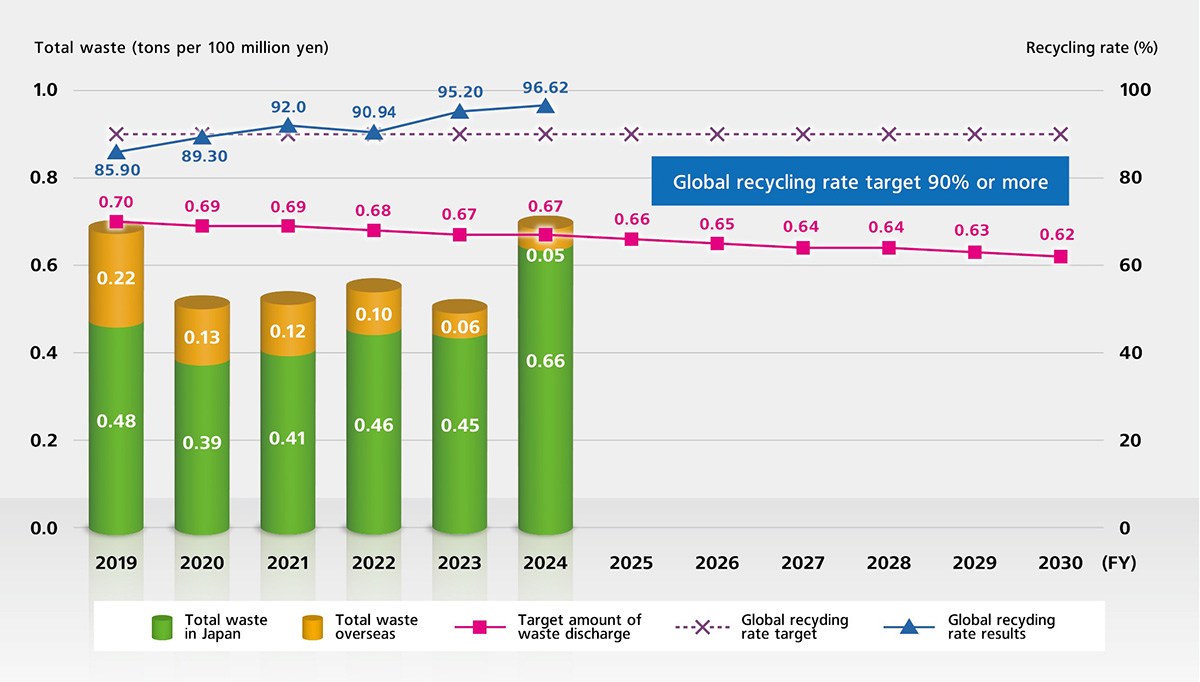 The JVCKENWOOD Group is actively engaged in initiatives such as waste reduction, diligently disassembling and sorting waste generated in the production processes and reusing it within the company or turning it into valuables. As a result, the Group’s business in Japan has achieved a recycling rate of 96.6% (FY2024), and the waste generation inside and outside Japan also declined. Our goal had been to reduce waste generation by 1% from the FY2019 level annually through FY2030. We have already achieved this goal and established the following targets in order to move forward with zero emissions globally and proceed further with reduction of total waste generation and recycling.