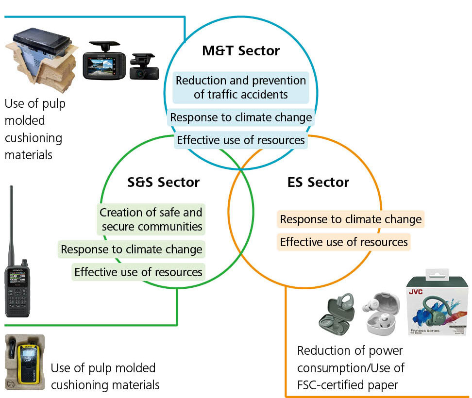 We aim to realize a sustainable society through the provision of sustainable products and services that contribute to solving social issues in each business sector. To create a safe and secure age of mobility, we have been developing car navigation systems and dashcams that contribute to the reduction and prevention of traffic accidents. We are also focusing on providing wireless radio systems that support the creation of safe and secure communities to ensure stable communication methods during emergencies, such as natural disasters and accidents. Further, we are promoting environmentally conscious product development by reducing power consumption in products and have adopted paper-based packaging for all headphones and earphones released since 2022. We are reducing our environmental load by gradually expanding the use of Forest Stewardship Council (FSC)-certified paper.
