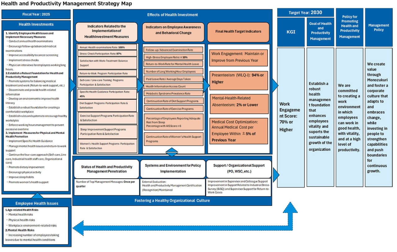 We have also set target indices of attaining the KGIs by FY2030. We aim to achieve each of the following: improved work engagement, sustained improvement in presenteeism, reduced absenteeism due to poor mental health, and optimization of medical costs. We have compiled these into a Health Management Strategy Map, and the entire company is promoting its initiatives.
