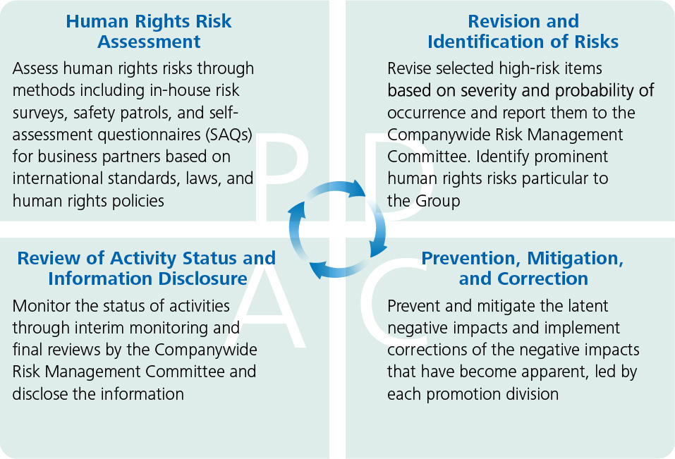 We analyze, and assess adverse human rights impacts through a risk surveillance process specific to human rights, also taking into consideration our Compliance Code of Conduct and Human Rights Policy, conducted by the Legal & Compliance Office based on international standards, domestic laws and regulations and trends in each country, annual self-assessment questionnaires (SAQ) for suppliers conducted by the Procurement Department, and periodic safety patrols conducted by the Safety and Health Committee.