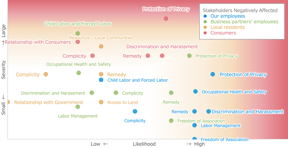 In FY2025, we conducted human rights due diligence in a similar fashion to FY2024, identifying and evaluating human rights risks regarding each of a range of stakeholders, such as employees, business partners, and local communities. As a result, we continue to position the three areas identified in the previous year as salient human rights issues, specifically, "protection of personal privacy (formerly, protection of personal information)," "discrimination and harassment," and "forced labor and child labor." We will continue our efforts to make improvements while monitoring the response status for each risk.