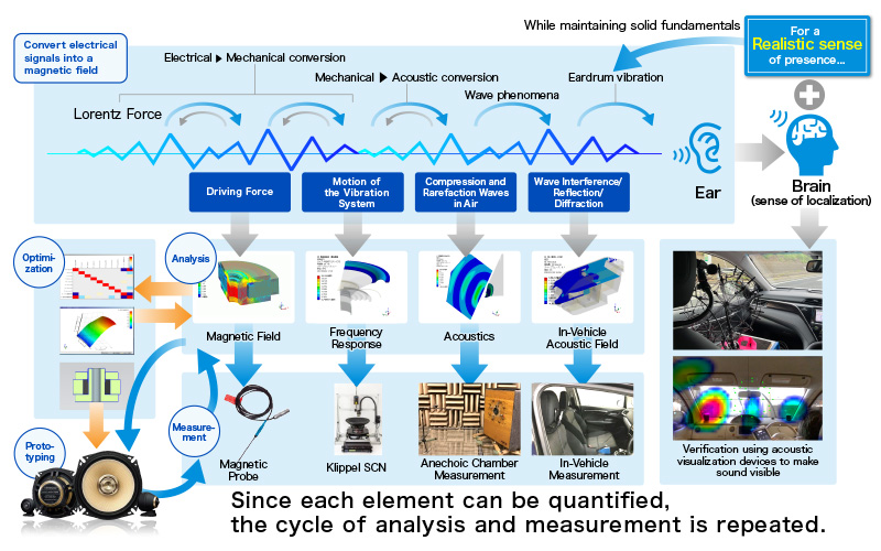 We strictly and repeatedly carry out processes such as sound quality design, measurement and analysis, and listening evaluations in measurable areas.