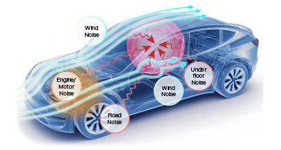 Acoustic technology not only complements high-frequency signals in CD and compressed audio sources but also adapts to the unique environment of the vehicle cabin. Inside a vehicle, various factors hinder the reproduction of original sound, such as reflection and absorption by glass and seats, variations in complex frequency and phase characteristics, asymmetric speaker placement, and different types of noise like road noise, wind noise, and engine noise. JVCKENWOOD optimizes its DSP to compensate for these numerous disadvantages and to create an ideal acoustic space.