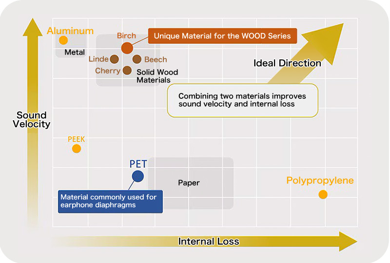 An ideal diaphragm material needs to transmit sound quickly and absorb unwanted vibrations. Faster propagation Velocity of sound wave allows even subtle details to be faithfully reproduced, while greater internal loss means unwanted reverberations are dampened, resulting in pure sound. The Wood Cone speaker’s diaphragm (birch) has a very fast propagation velocity of sound wave and exhibits large internal damping, unlike other materials with similar speed. This combination enables the reproduction of delicate, rich and clear sound.
