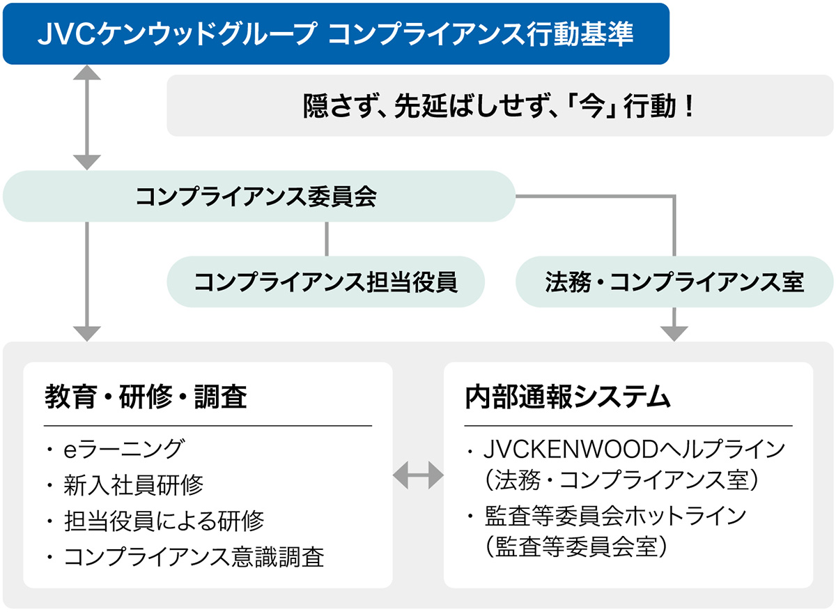 人々の価値観が急激に変化する中で、たとえ法令違反でなくとも社会的な要請に反する行為は企業価値の毀損につながり得ることから、当社グループではコンプライアンスを法令遵守にとどまらず、社会的な要請への適切な対応であると考え、取り組みを強化しています。この基本的な考え方のもと、CEOを委員長とするコンプライアンス委員会と法務・コンプライアンス室内部統制グループの主導により策定された「JVCケンウッドグループ コンプライアンス行動基準」を全ての役員、従業員に適用し、基本姿勢「隠さず、先延ばしせず、『今』行動!」を実践すべく、周知を徹底しています。行動基準をはじめとする企業倫理上の違反があった場合には、速やかに再発防止策を講じることとしています。