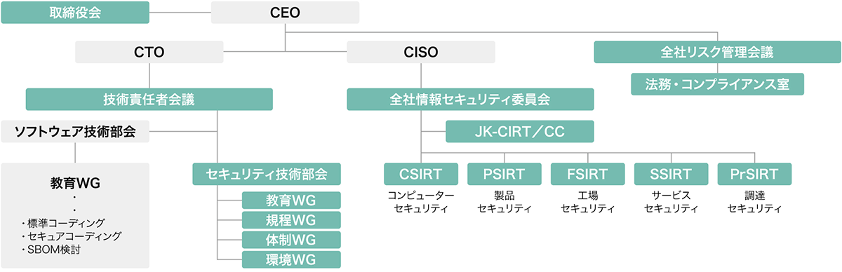 JVCケンウッドグループは、「情報セキュリティ基本方針」に基づき、情報管理に関する規程類の策定、対策の導入、従業員教育など、情報セキュリティ体制の構築、強化を進めるとともに、常に外部環境の変化や情報資産に関わる脅威を認識し、情報セキュリティの確保および迅速に対応する体制を構築しています。取締役会による業務執行の監督・指導のもと、CEOと最高情報セキュリティ責任者(CISO:Chief Information Security Officer)を委員長、CISO傘下に設置されたJK-CIRT/CC(JVCKENWOOD Central Incident Response Team/Coordination Center)を事務局とする「全社情報セキュリティ委員会」を定期的に開催し、情報セキュリティリスクアセスメント等の活動を通じて、情報セキュリティマネジメントの整備、運用状況のモニタリングを行い、必要施策を実施する体制を整備しています。具体的には、情報システムにおいて統合サーバへの集約や、外部からの標的型攻撃対策訓練の実施、CSIRT(Computer Security Incident Response Team)運営などを実施しています。製品セキュリティに関しては、情報セキュリティに関する基本方針のグループワイド展開、PSIRT(Product Security Incident Response Team)運営などを実施しています。また、これらの取り組みにあたっては、全社リスク管理会義の事務局である法務・コンプライアンス室と連携しながら、包括的に情報セキュリティのガバナンスを強化しています。