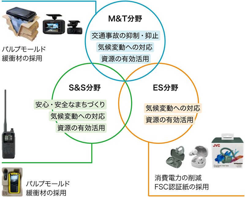 各事業分野において、社会課題の解決に貢献するサステナブルな商品・サービスの提供を通じて持続可能な社会の実現を目指しています。安心・安全なモビリティ社会の構築に向けては、交通事故の抑制・抑止に寄与するカーナビゲーションシステムやドライブレコーダーを展開しています。また、災害や事故などの緊急時にも安定した通信手段を確保し、地域の安心・安全なまちづくりを支える無線システムの提供にも注力しています。さらに、製品における消費電力の削減を図るとともに、ヘッドホン・イヤホンにおいては2022年以降に発売された全ての製品の梱包材に紙材を使用し、FSC認証紙の採用を段階的に拡大することで、環境負荷の低減を図るなど環境に配慮した製品開発を推進しています。