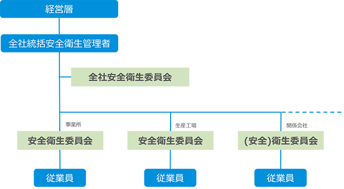 各事業場、関係会社には、法令に従って規模に応じた安全衛生委員会(または衛生委員会)を設置しています。毎月1回以上定期的に開催し、各事業場の状況に応じた労働安全衛生活動を推進しています。50人未満の営業拠点などにおいては、上位組織によって安全衛生に関する情報提供や、人員に応じて安全衛生推進者を選任し、定期的に労働者の意見を聴く場を設けています。